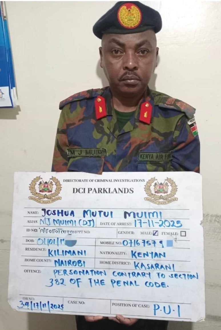 Parklands, Nairobi – The Directorate of Criminal Investigations (DCI) has arrested Joshua Mutui Muimi, a man who falsely claimed to be a Kenya Defence Forces (KDF) brigadier.